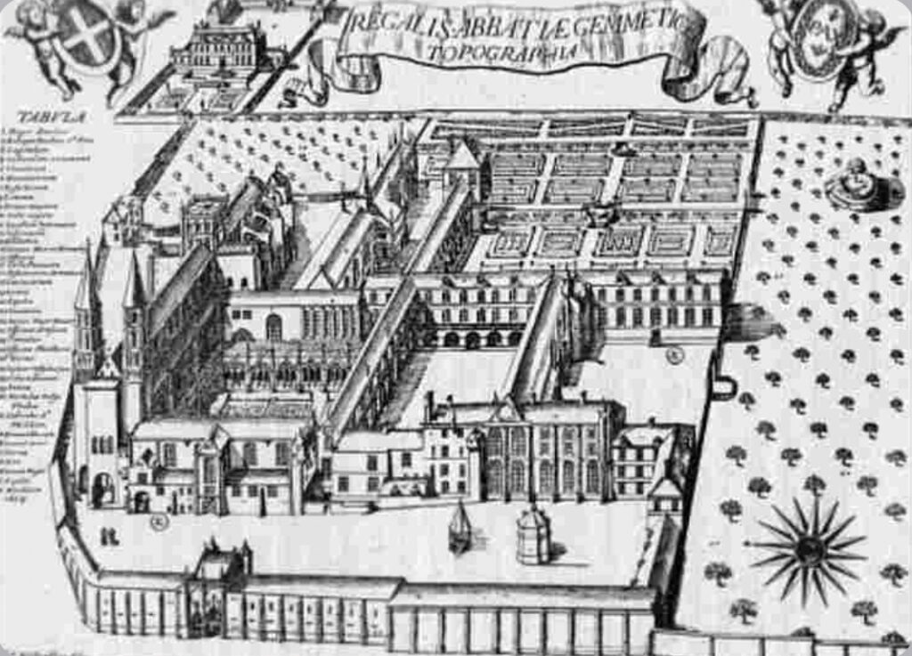 Difficile d’imaginer ce que fut l’Abbaye de Jumièges avant son morcellement et son démantèlement, un dessin ancien nous permet d’envisager l’importance et la taille des bâtiments.