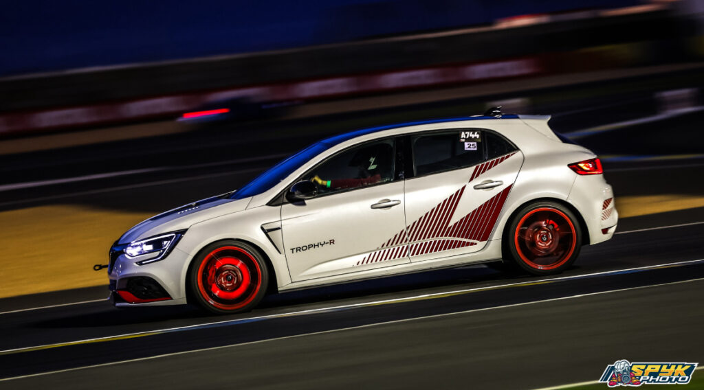 Pénombre permettant à notre photographe d’illustrer son talent en profitant des couleurs changeantes notamment grâce aux nombreux éclairages du circuit, aux phares allumés et aux disques de frein rouge qui confèrent aux photos une sensibilité particulière. On se croirait presque aux 24h du Mans !