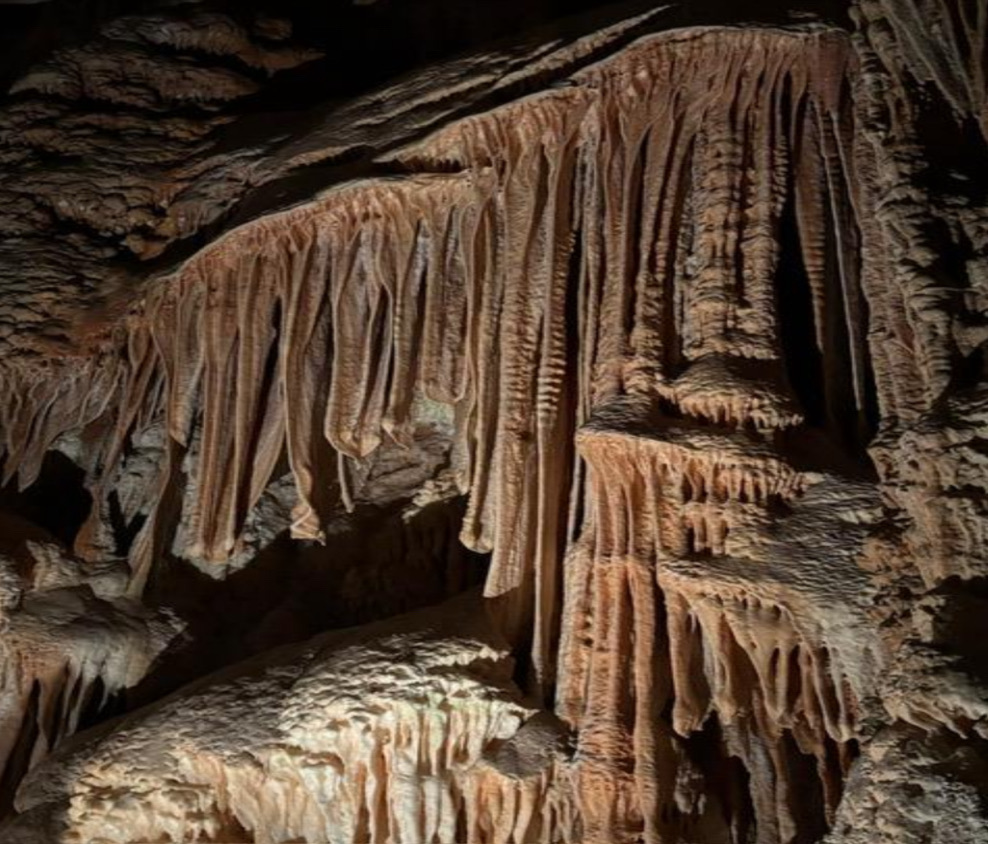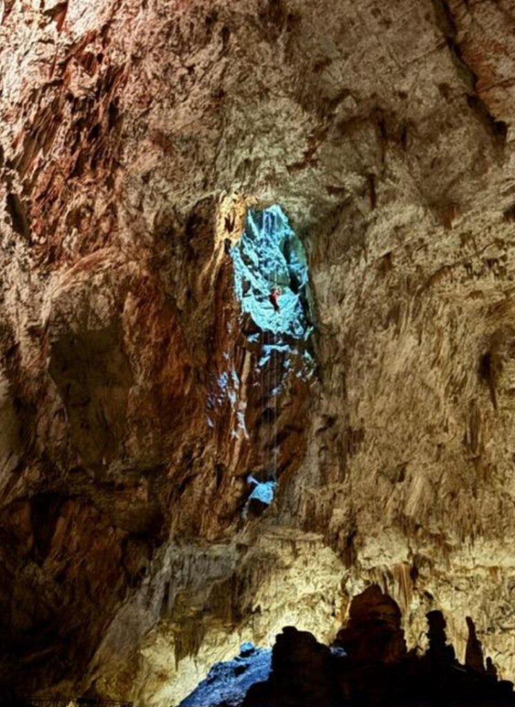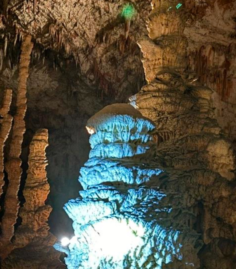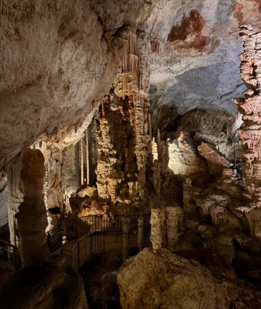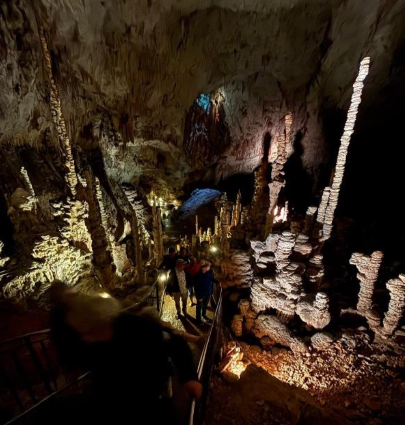 Tout au long de notre descente, nous ne cessons de nous émerveiller : chaque salle nous révèle un spectacle grandiose et nous dévoile le travail de l’eau : notre guide, grâce à un jeu de lumières, fait apparaître de gigantesques stalagmites et stalactites : la Tour de Pise, les piles d’assiettes, les palmiers géants, la pomme de pin…