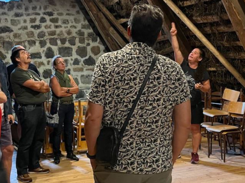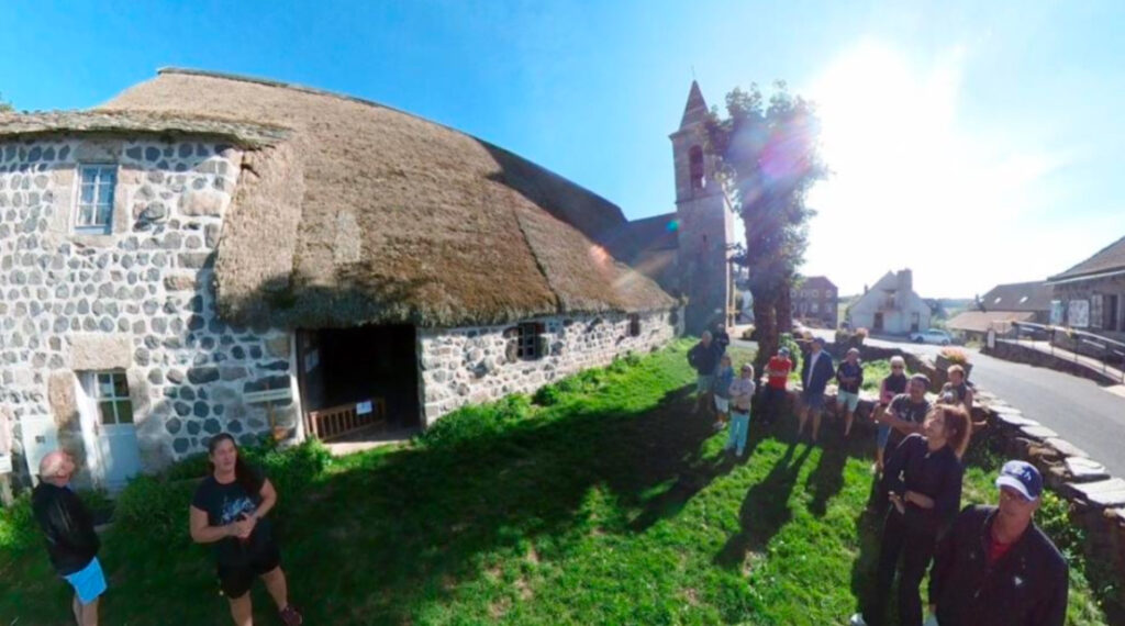 Eh oui, c’est là notre destination, précédée à Sainte-Eulalie, de la visite de la ferme de Clastres, une bâtisse composée de trois parties : une partie couverte de genêts, une partie couverte en chaume et une partie couverte de lauzes.