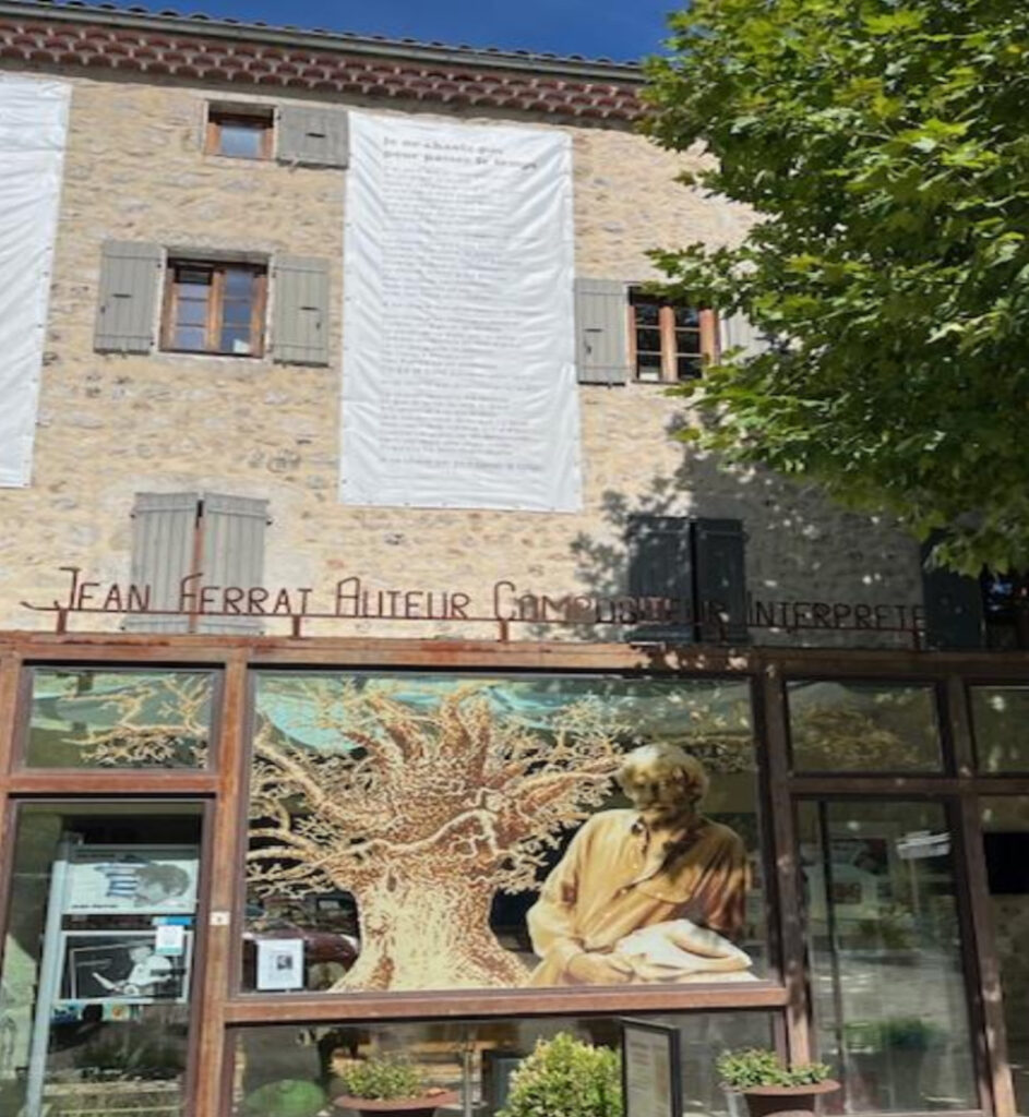 Retour aux voitures à 14h00 et départ pour Antraigues où nous sommes attendus à la « maison » de Jean Ferrat…. Petite déception peut- être : il ne s’agit pas vraiment de SA maison mais de ce que certains appelleront peut-être plus un musée, situé sur la place principale de cette petite ville d’Antraigues où Jean Ferrat, qui avait fait de cette commune son havre de paix, aimait retrouver ceux qui l’avaient adopté et disputer avec eux des parties de pétanque acharnées.